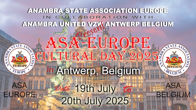 Anambra State Association Europe yearly Cultural Event (Cultural Day) is scheduled in Antwerpen Belgium. It's sponsored by Anambra United Vzw Belgium (ASA Belgium).